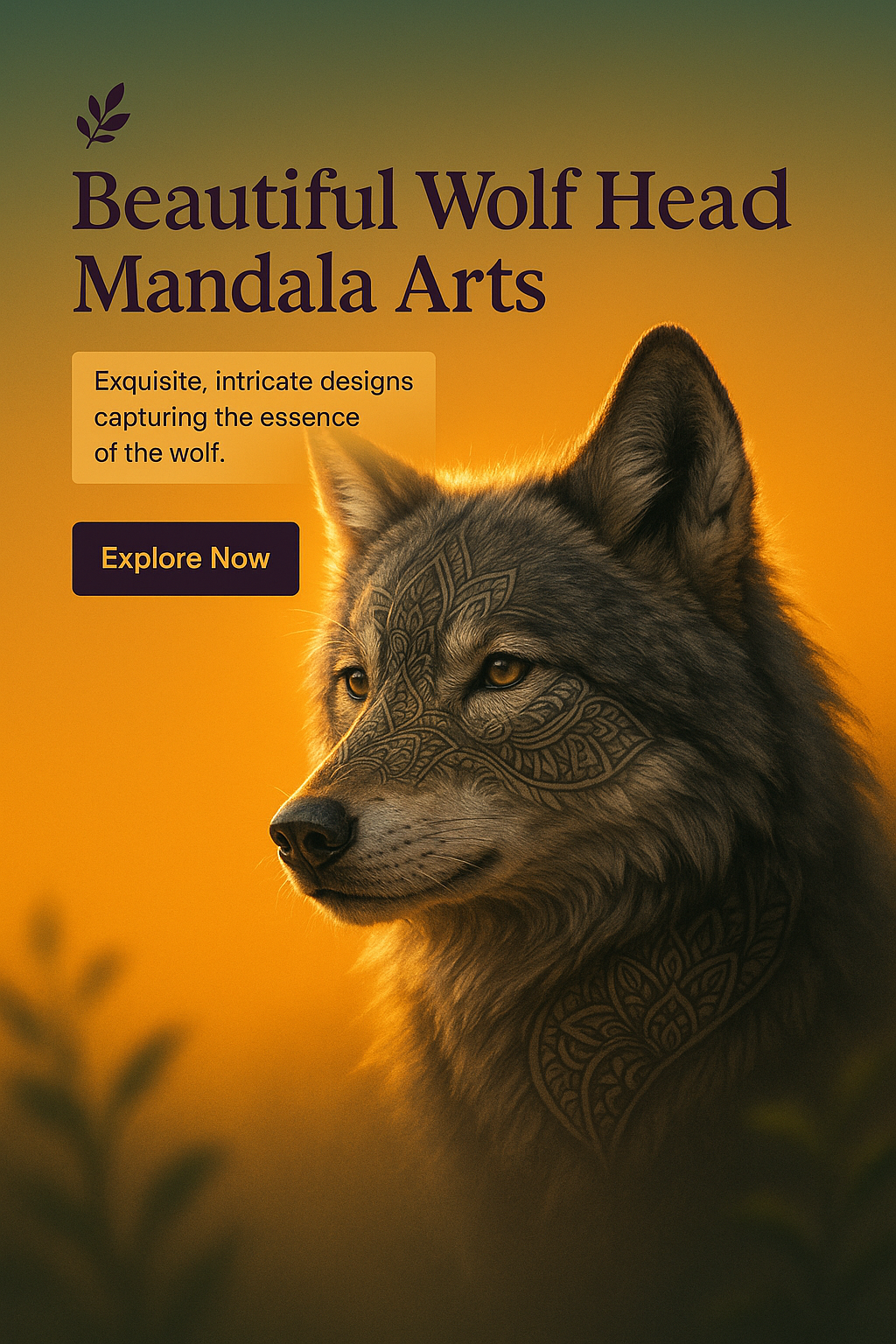 A visually striking promotional graphic showcasing a wolf head with mandala designs. It aims to attract art enthusiasts interested in unique animal-themed artwork.