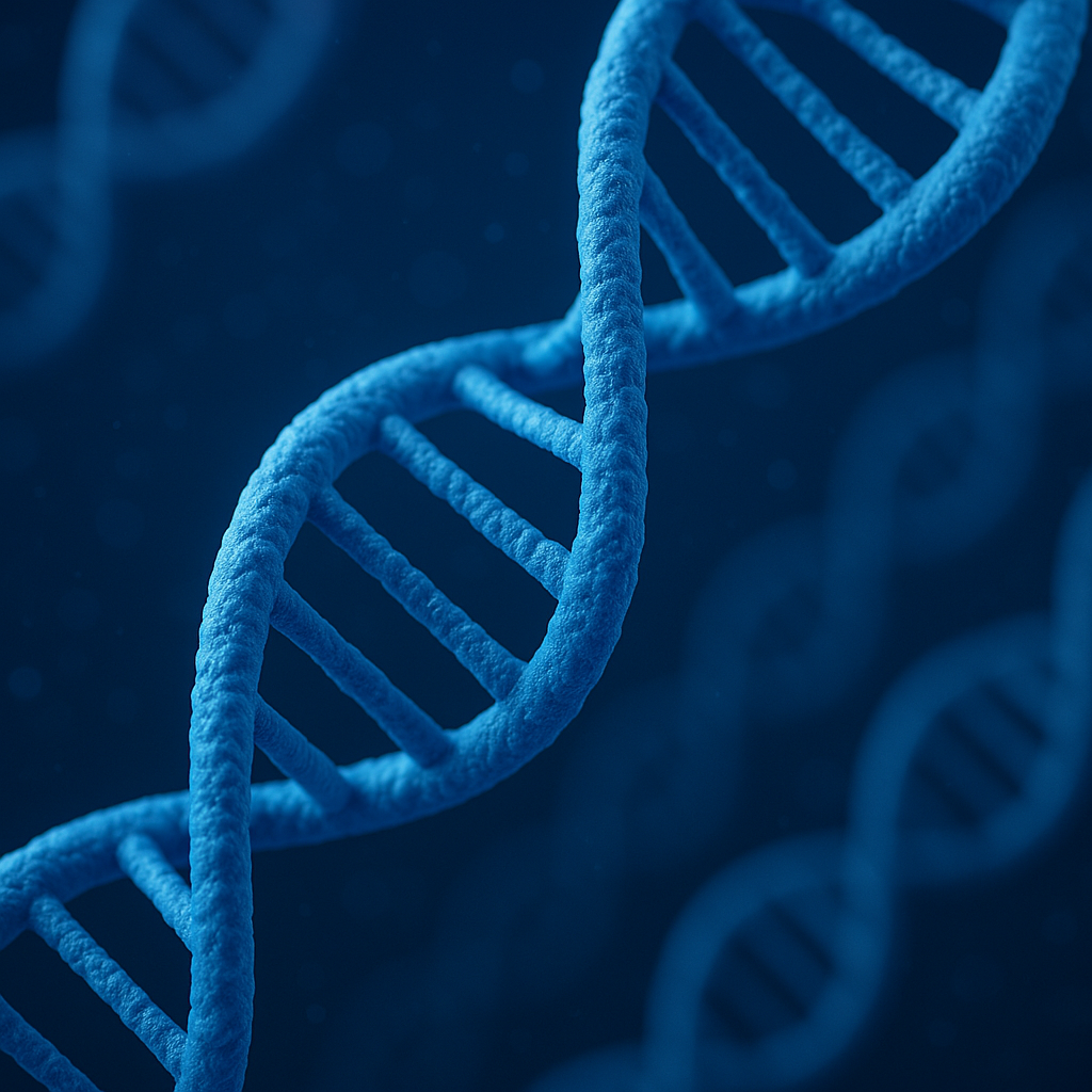 A visually striking 3D illustration of a DNA double helix, featuring vibrant blue colors against a dark background, suitable for scientific publications and educational materials.