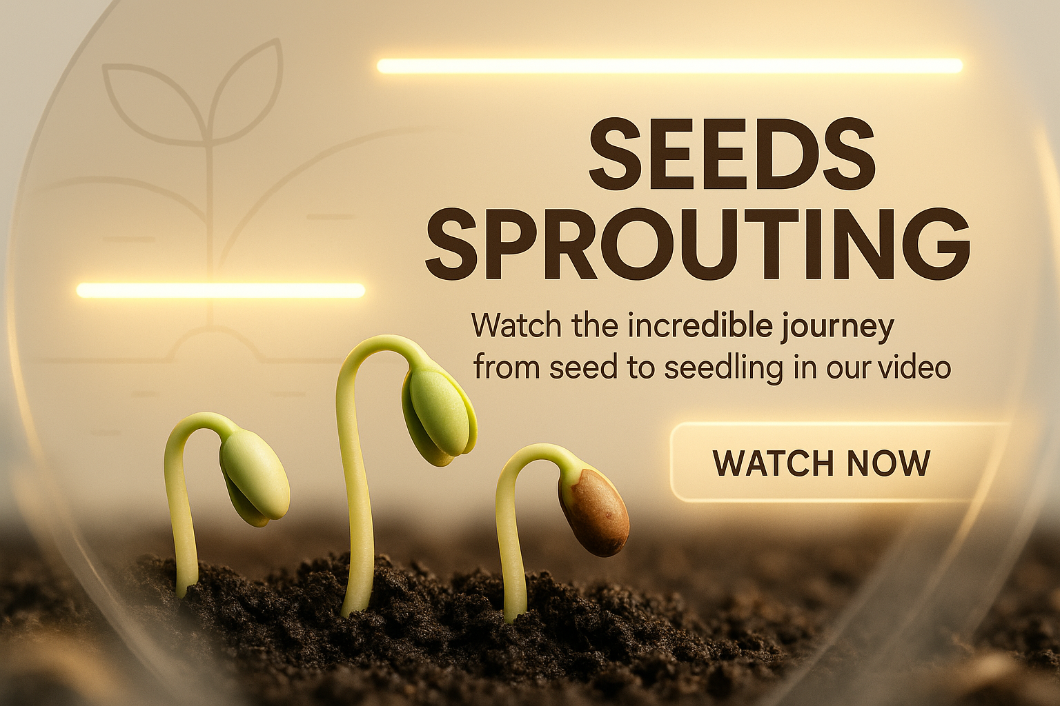 /Collection: /by davooda/Type: PNG/Engaging promotional graphic featuring sprouting seeds, designed to invite viewers to watch an educational video about the growth process from seed to seedling. The modern design elements enhance its appeal.