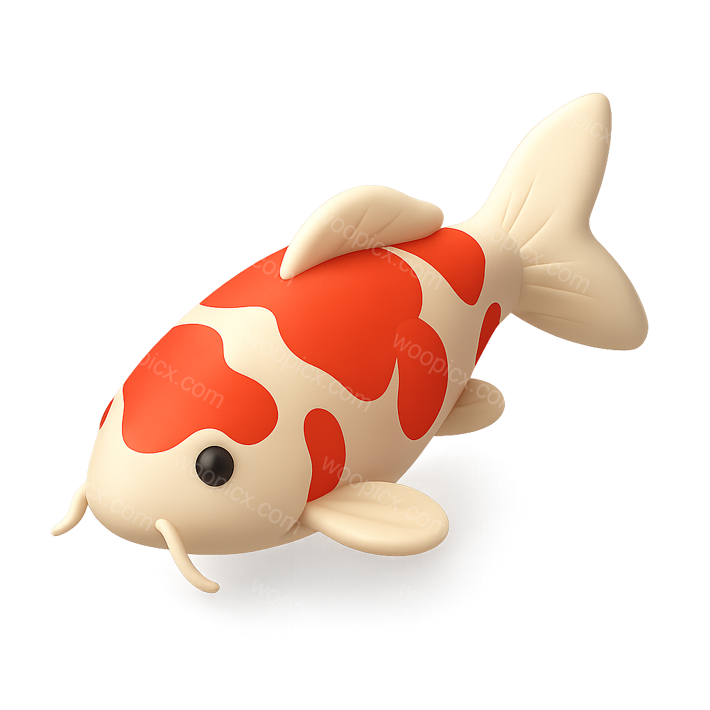 /Premium/Collection: /by davooda/Type: PNG/A vibrant 3D representation of a koi fish featuring a glossy finish, set against a transparent background. The fish is designed in a playful style with red and white patterns, presented in a three-quarter isometric view.