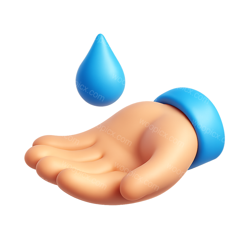 A stylized 3D icon depicting a hand reaching out to receive a blue drop of liquid, set against a smooth gradient background. The design features a volumetric and isometric view.