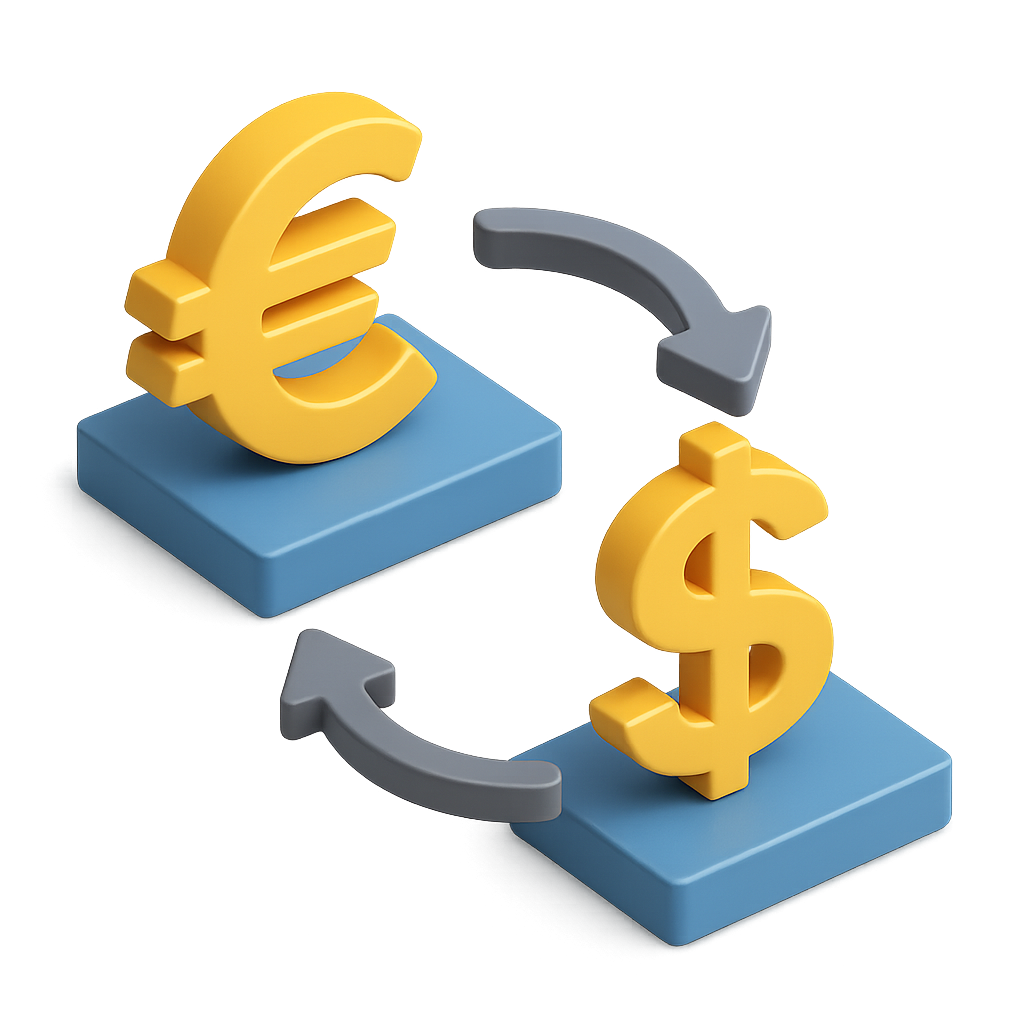 /Collection: /by davooda/Type: PNG/A 3D representation of currency symbols, featuring a Euro and a Dollar sign on blue platforms, with arrows indicating exchange, all presented in a volumetric style.