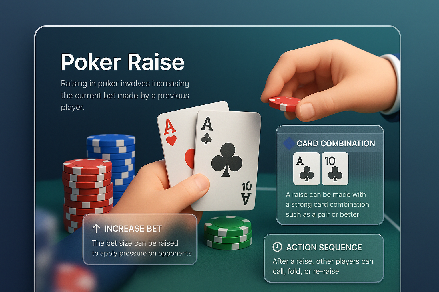 A visually engaging 3D illustration showcasing a poker raise concept, featuring hands holding cards and colorful chips. The layout includes informational blocks with patterns and clear text.