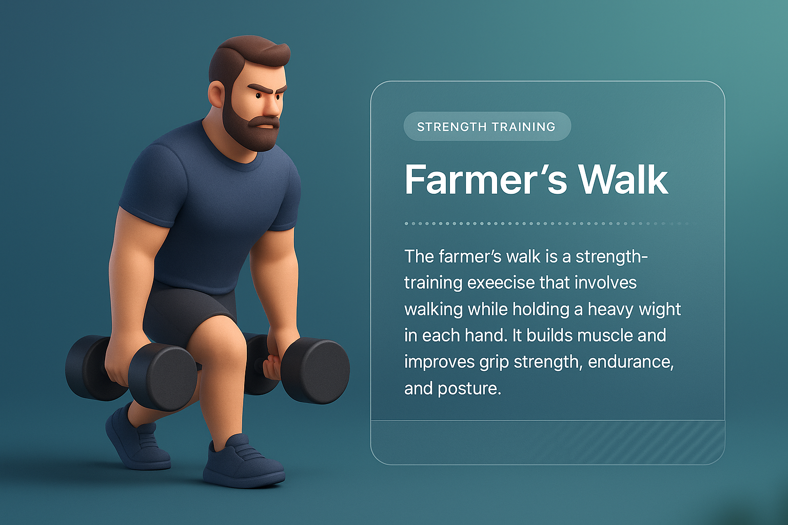A 3D illustration showcasing a man performing the farmer's walk exercise, holding dumbbells. The design features a sleek gradient background and an informative text block integrated seamlessly into the image.