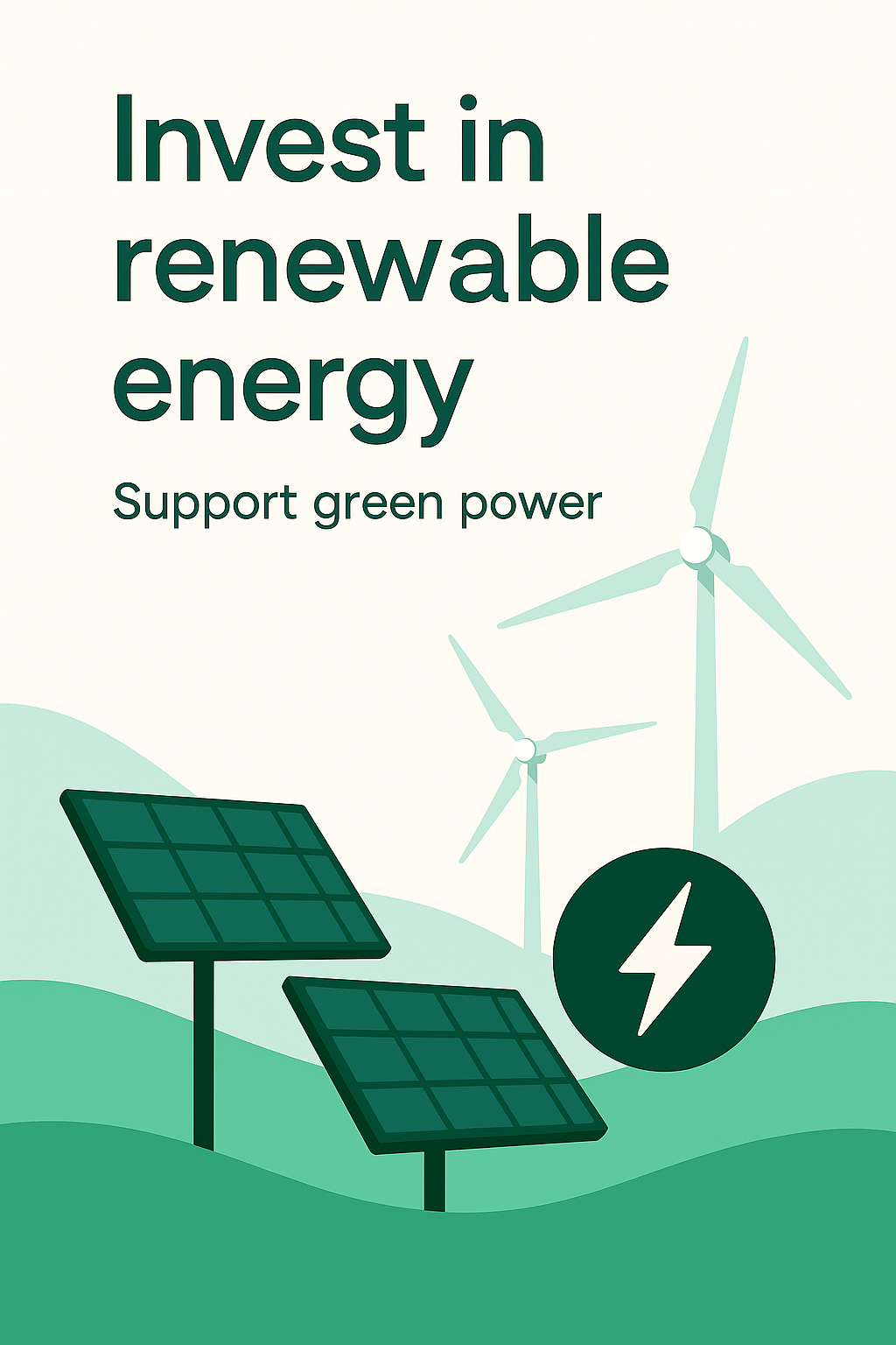 Illustrative graphic promoting investment in renewable energy with a clean design. Features solar panels and wind turbines, ideal for environmental campaigns.