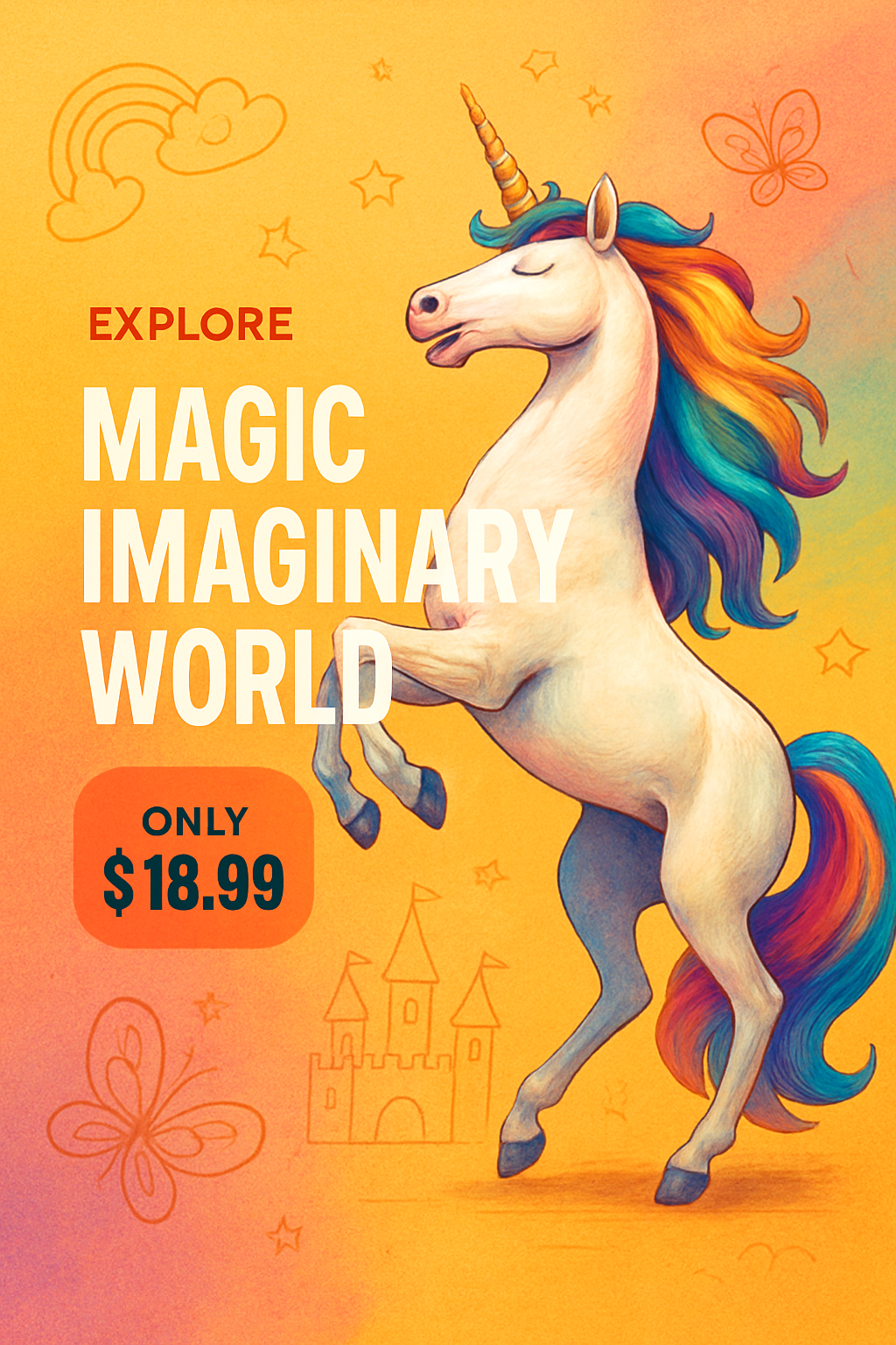 A lively advertisement featuring a colorful unicorn in a whimsical setting. The ad showcases bold typography and a price tag, emphasizing a magical theme.