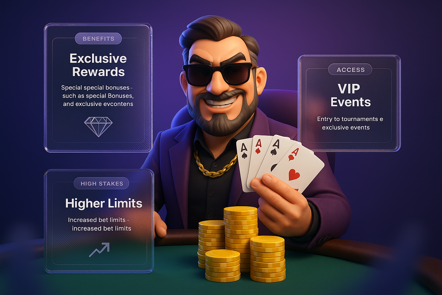 /Collection: /by davooda/Type: PNG/A dynamic 3D illustration featuring a VIP player holding playing cards, surrounded by stacks of poker chips. The design includes information blocks highlighting exclusive rewards and access.