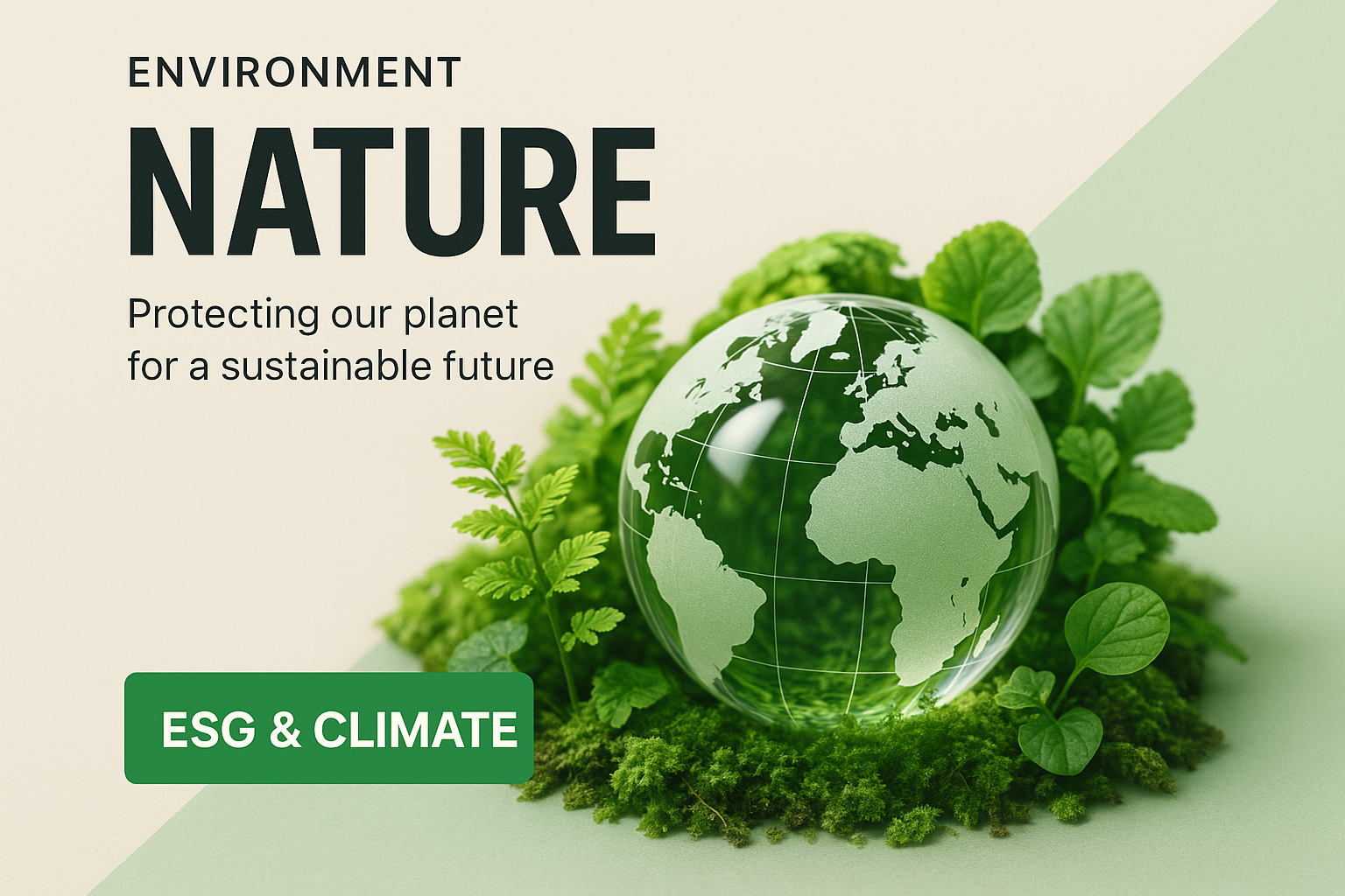 /Collection: /by davooda/Type: PNG/A glass globe featuring a world map is surrounded by lush green foliage, highlighting themes of nature, sustainability, and climate awareness. The modern design includes dynamic color fields and bold typography.