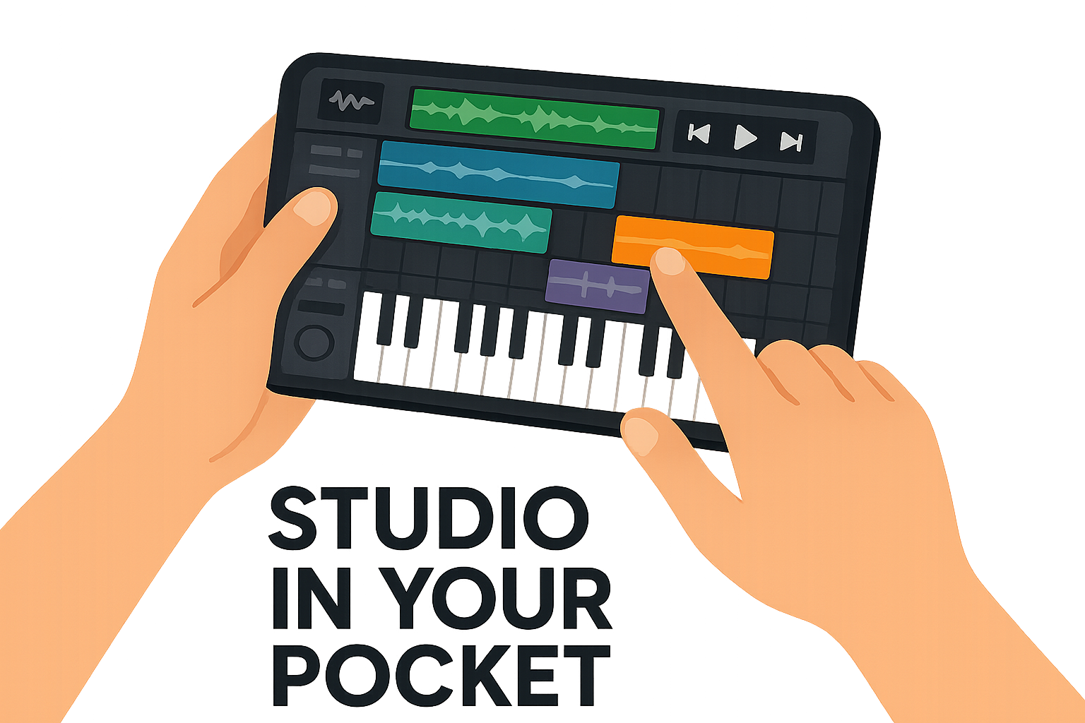 Illustration depicting a hands-on digital interface for music production, ideal for promoting music apps or educational content in audio production.