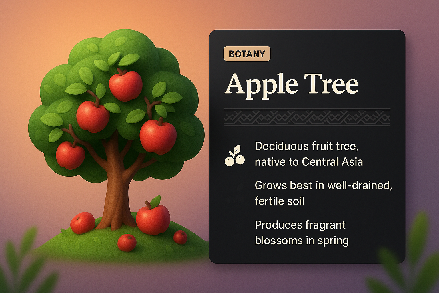 /Collection: /by davooda/Type: PNG/A vibrant 3D illustration of an apple tree featuring red apples and a gradient background. Integrated into the design is a dark panel with botanical information about the tree.