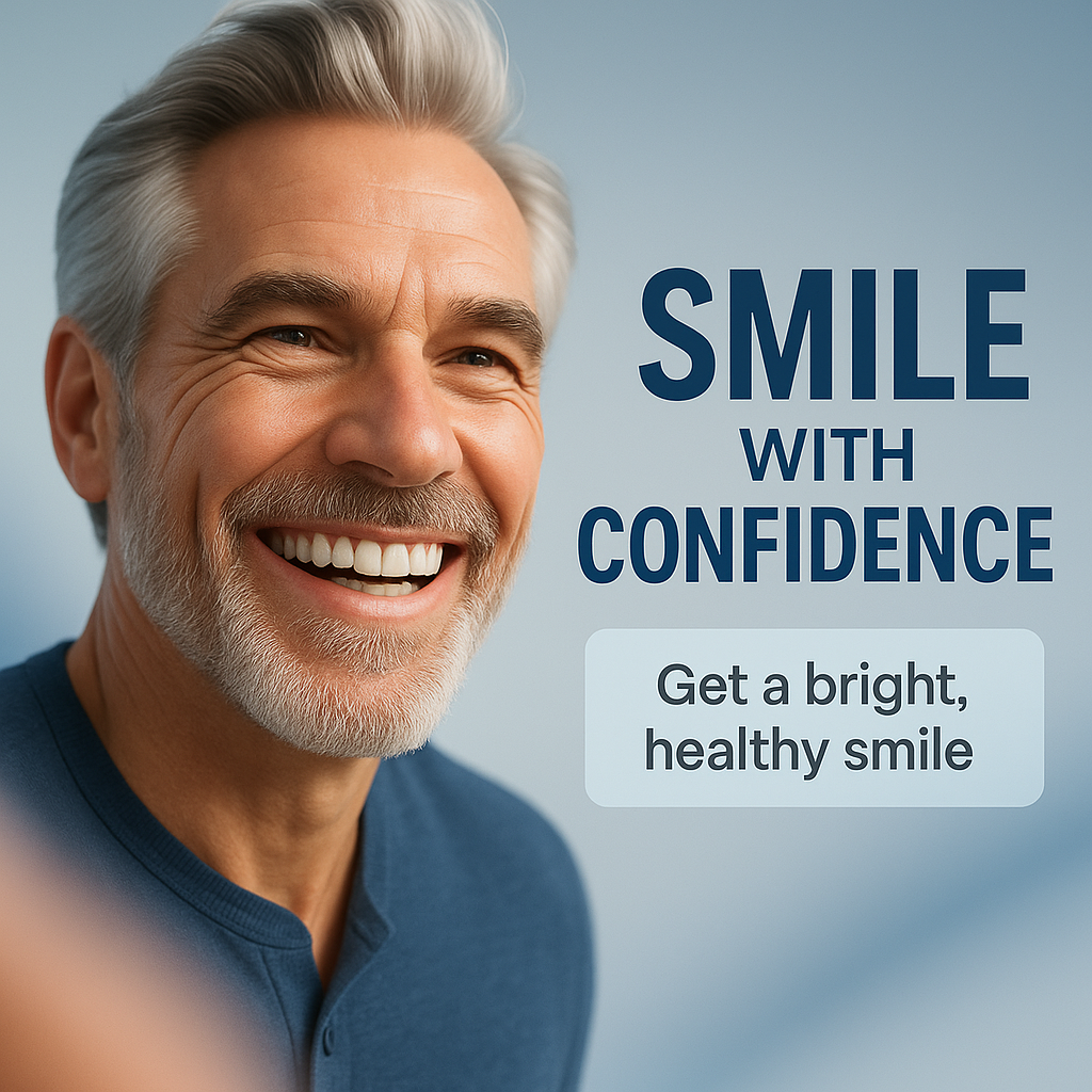 /Collection: /by davooda/Type: PNG/This is a promotional graphic designed to encourage confidence in dental health. It features a smiling older man with a bright smile, ideal for dental services or health awareness campaigns.