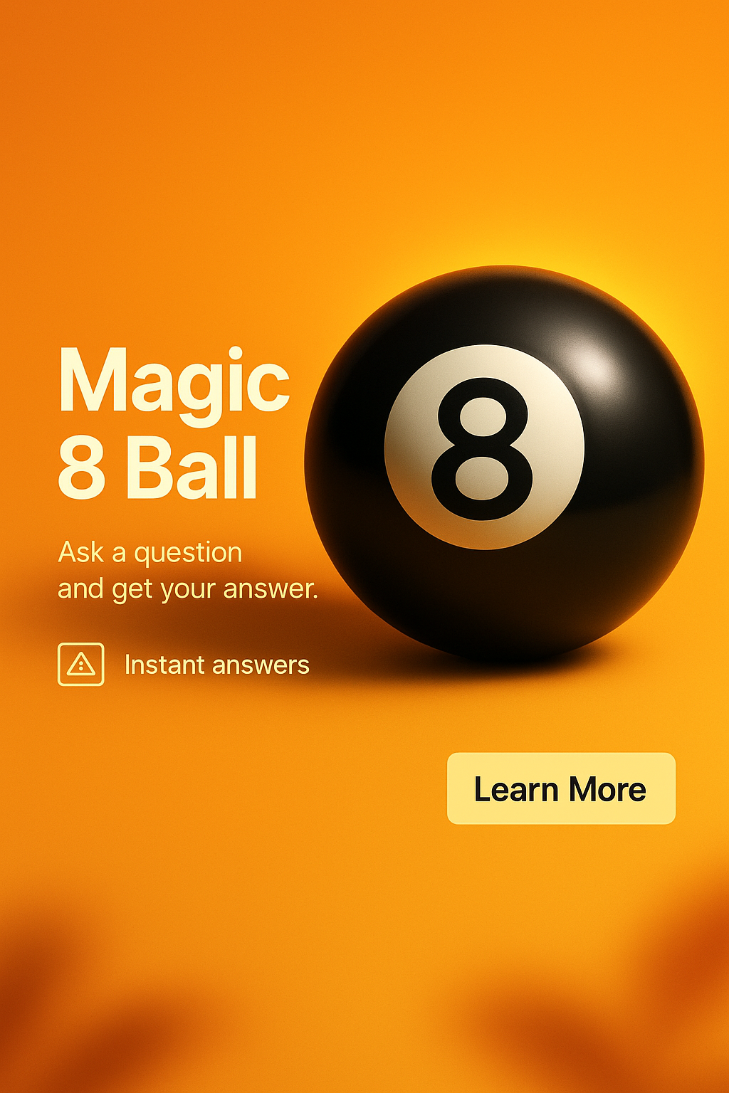 This image features a promotional graphic for a Magic 8 Ball, designed with a modern aesthetic. It invites users to ask questions and receive instant answers, suitable for web or social media use.