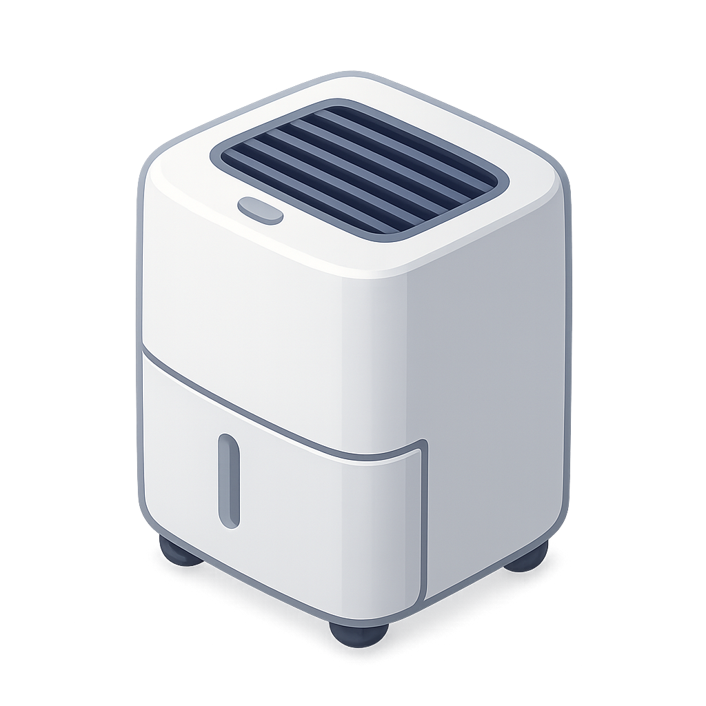 A sleek 3D icon of a dehumidifier viewed from a three-quarter angle, featuring a glossy white exterior and horizontal slats on top, designed with a modern aesthetic.