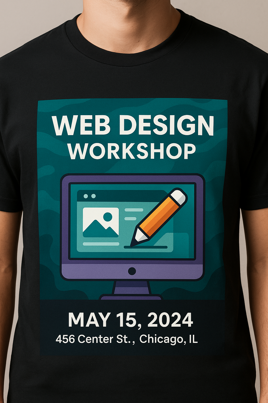/Collection: /by davooda/Type: PNG/A promotional t-shirt design featuring a graphic of a computer screen and pencil, aimed at marketing a web design workshop. The modern and vibrant style appeals to tech enthusiasts and professionals.