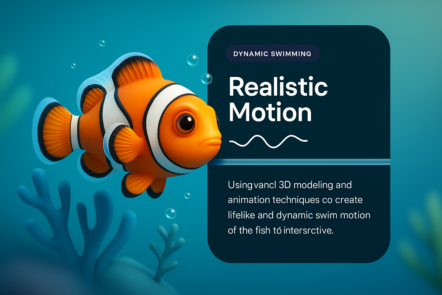 /Collection: /by davooda/Type: PNG/A vibrant 3D illustration of an orange and white clown fish surrounded by soft coral elements, emphasizing realistic motion. The design features a smooth gradient background and informative text block.
