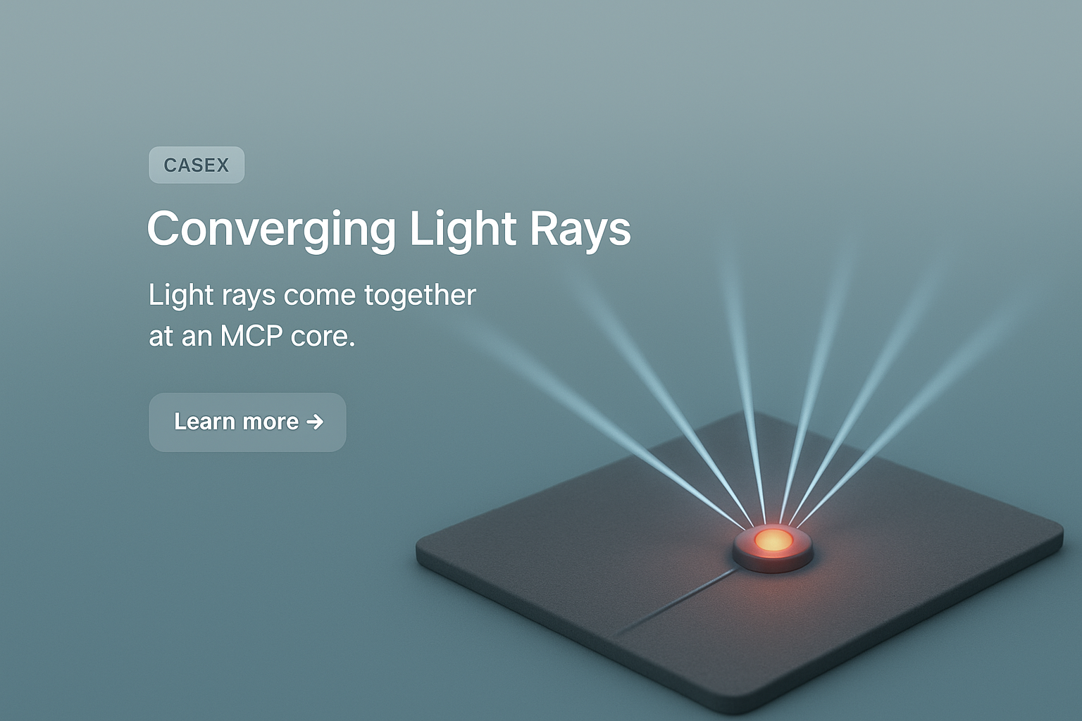A detailed 3D scene depicting converging light rays at an MCP core, with a smooth gradient background. The scene is zoomed out, showcasing a small-scale object in a larger context.