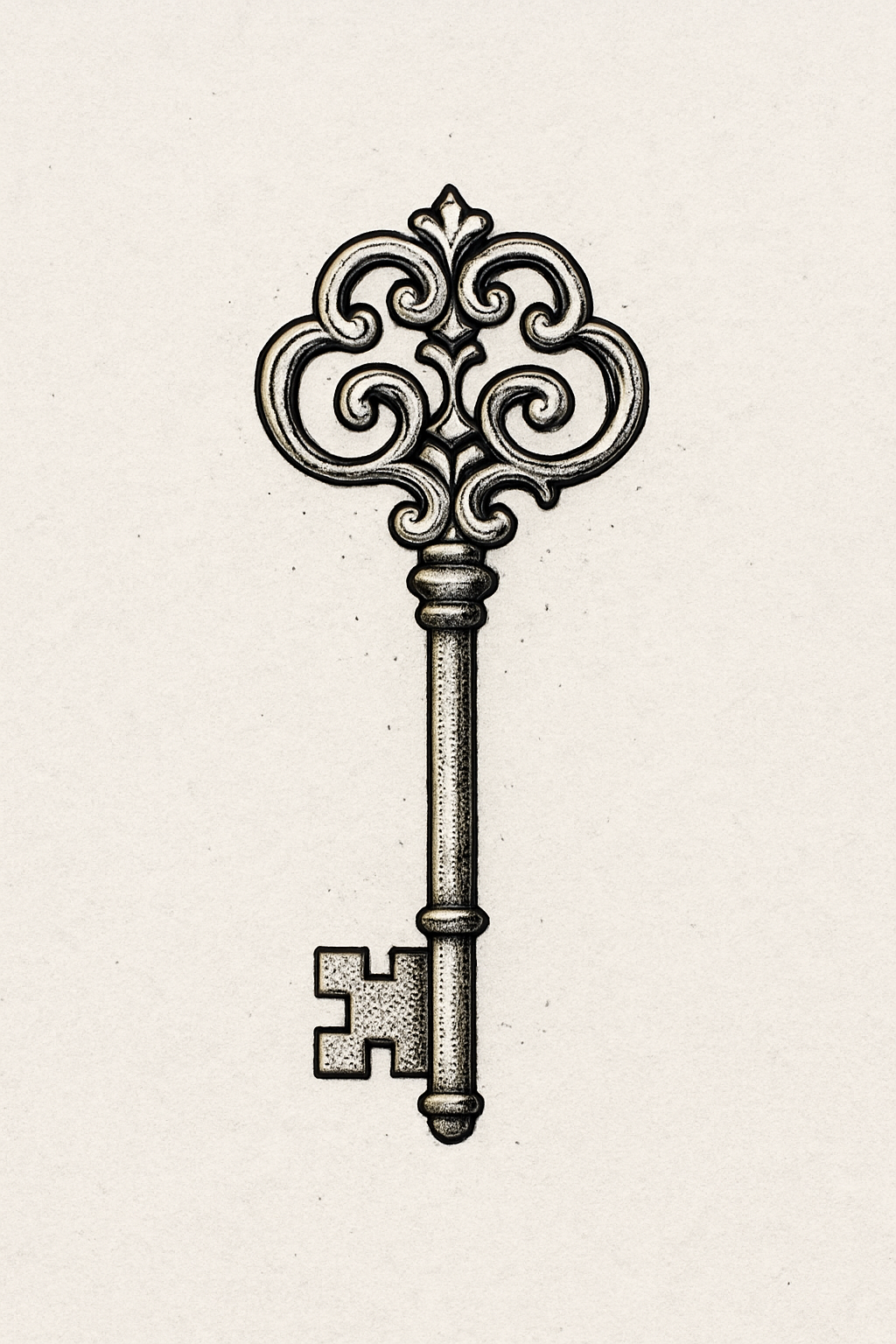 This image features a beautifully detailed vintage key illustration, ideal for use in art, design projects, or as decorative elements in various media.