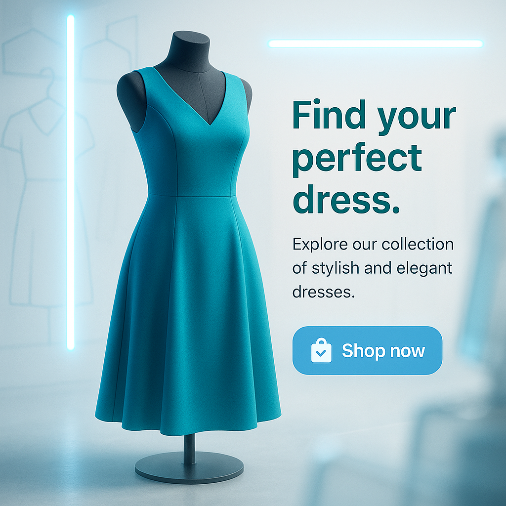 Stylish promotional banner featuring a turquoise dress on a mannequin, designed for online shopping. Ideal for fashion retail marketing.