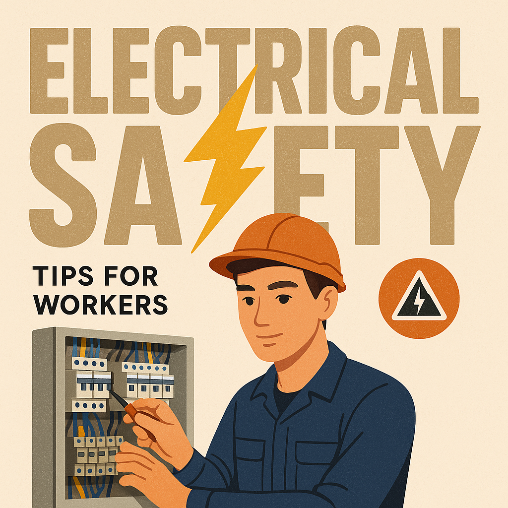 /Collection: /by davooda/Type: PNG/Illustrative graphic emphasizing electrical safety tips for workers, featuring a character interacting with electrical panels. Designed for educational purposes in workplace safety training.