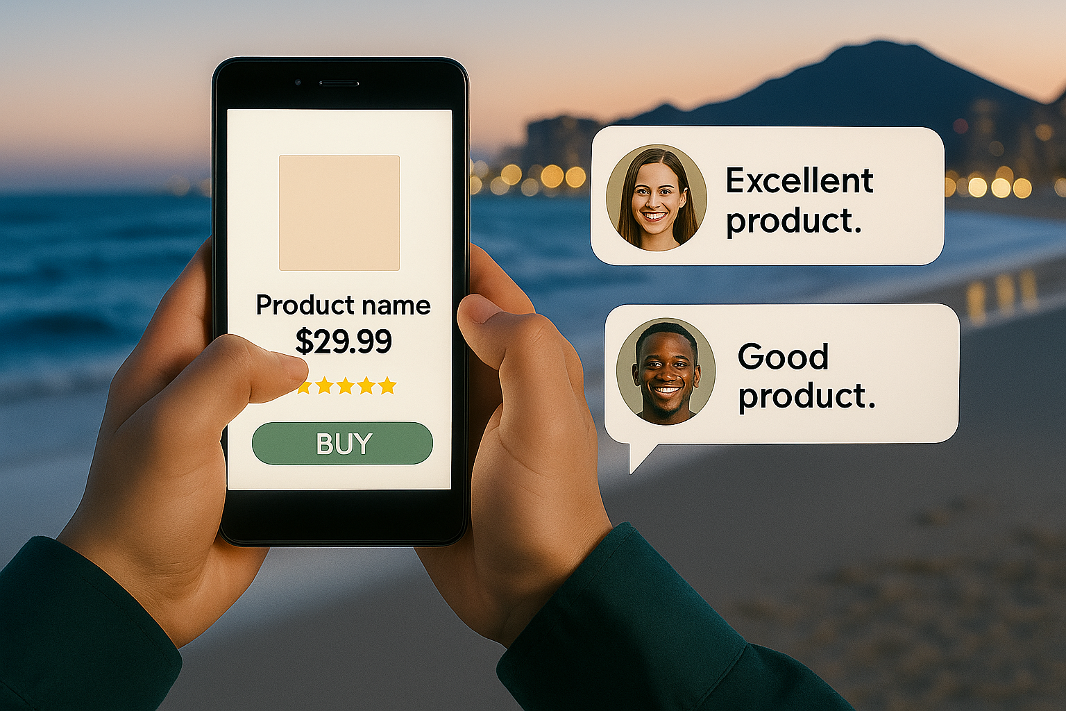 Digital mockup of a smartphone displaying a product with customer reviews, designed for e-commerce marketing. The beach background adds a relaxed vibe, appealing to online shoppers.