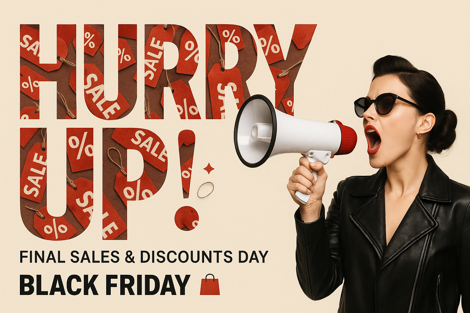 /Collection: /by davooda/Type: PNG/Vibrant promotional graphic for Black Friday featuring a woman with a megaphone, emphasizing urgency for final sales and discounts. Ideal for e-commerce marketing.