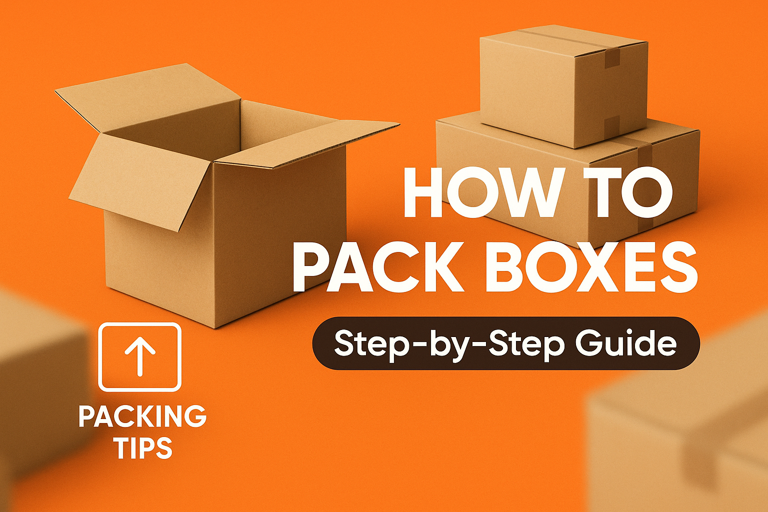/Collection: /by davooda/Type: PNG/Informative graphic showcasing a step-by-step guide on packing boxes, featuring a clean design with an orange background and cardboard boxes, suitable for moving tips or packing advice.