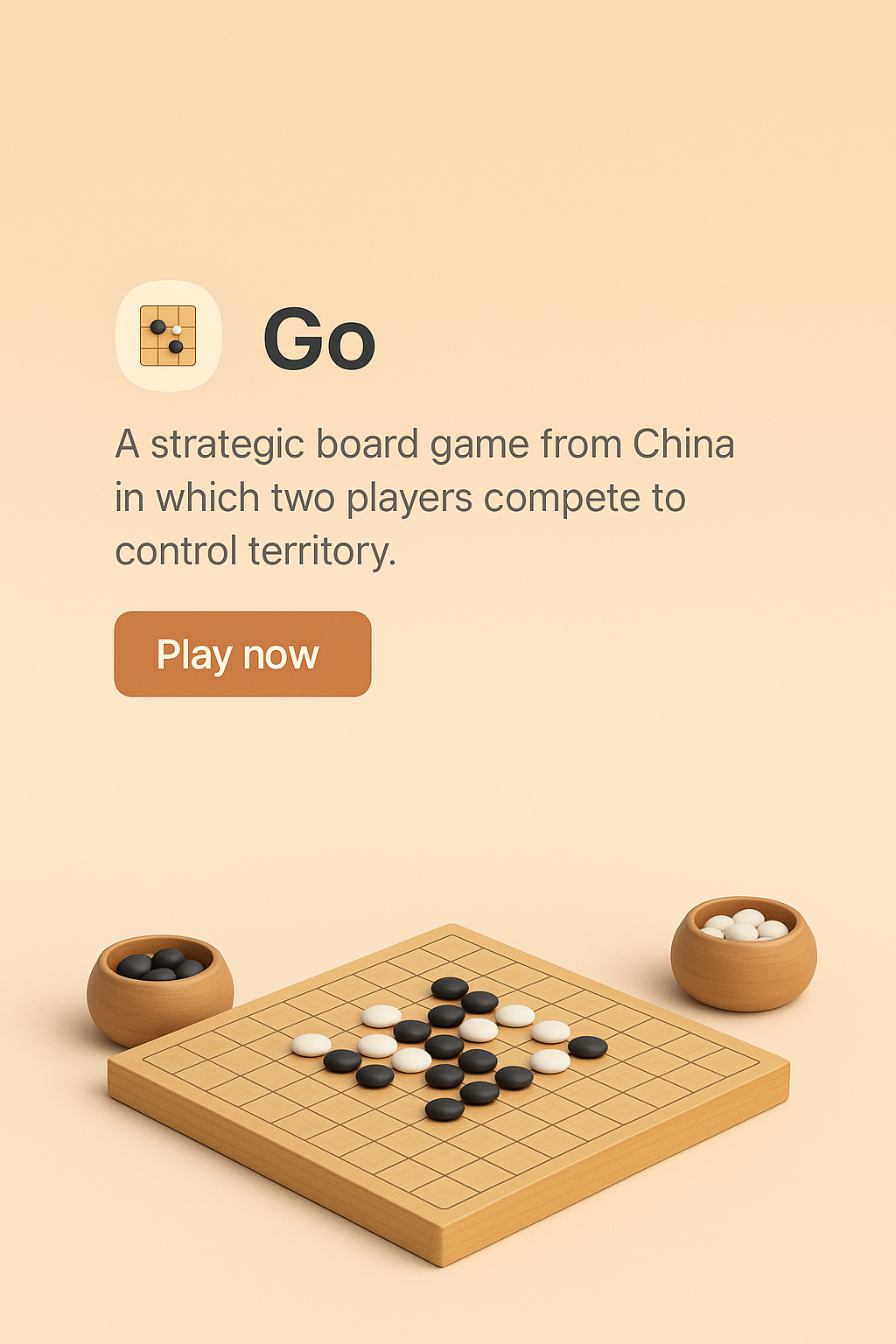 A visually appealing 3D scene depicting the board game Go, featuring a clean background, informative text, and action button for user engagement.