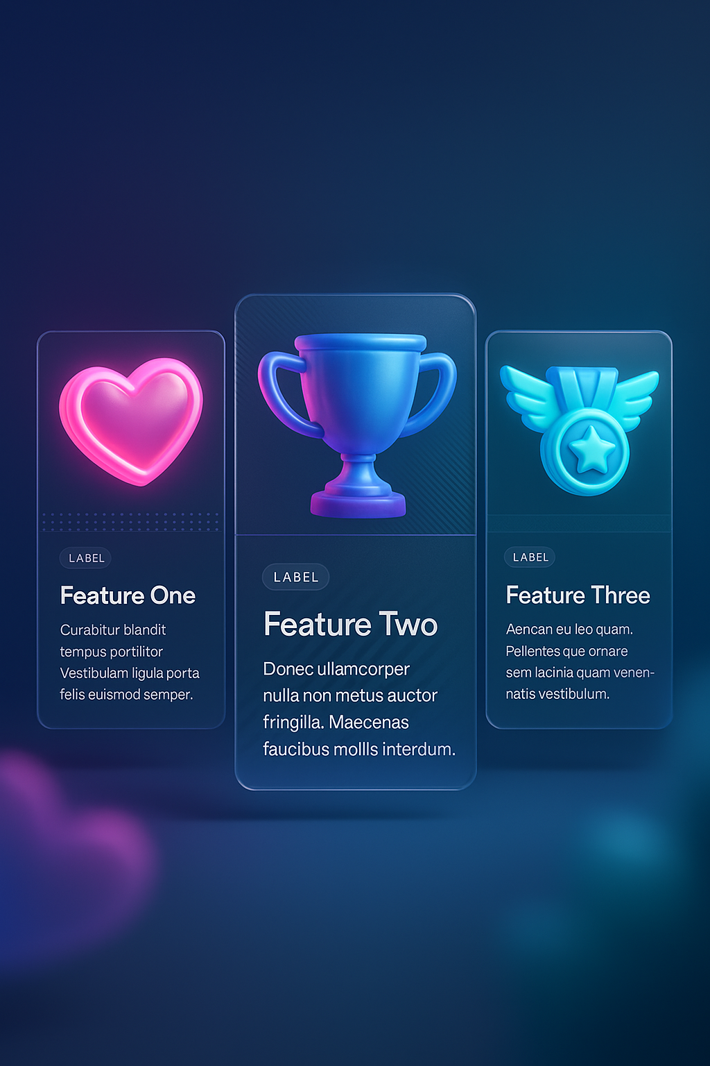 A vibrant 3D illustration showcasing neon icons including a heart, trophy, and medal with wings, displayed against a smooth gradient background.