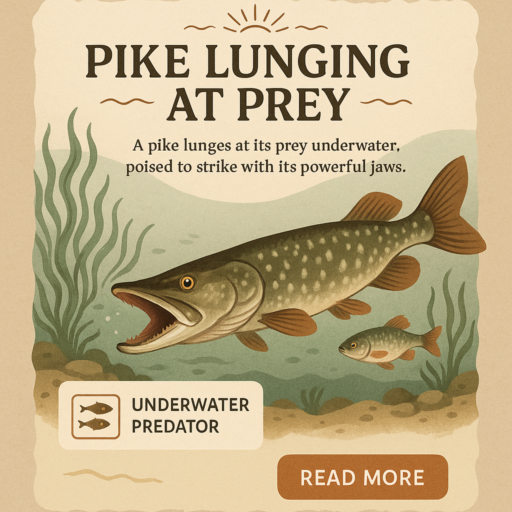 An artistic depiction of a pike lunging at its prey underwater, showcasing its powerful jaws and natural habitat with a clean, boho design.