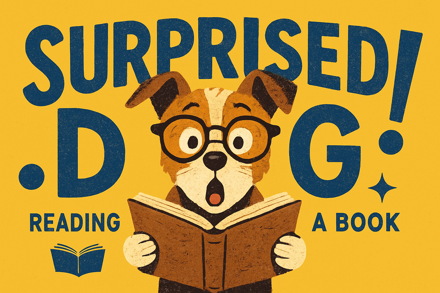 Charming graphic featuring a surprised dog wearing glasses and reading a book, set against a bright yellow background. Ideal for children's literature or educational materials.