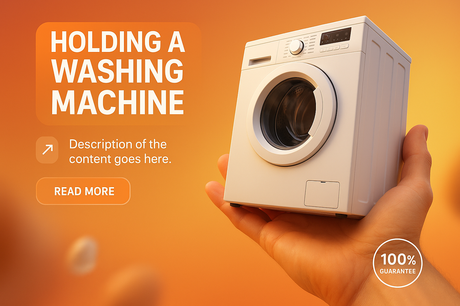 /Collection: /by davooda/Type: PNG/A visually engaging promotional graphic showcasing a hand holding a washing machine. The design features a warm gradient background and modern typography, ideal for marketing home appliances.