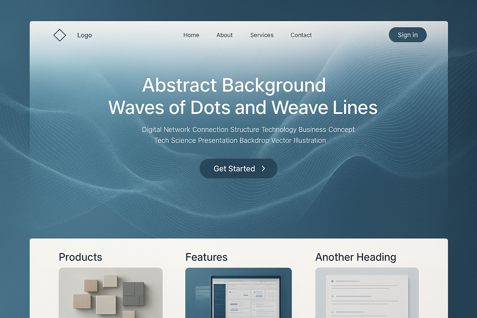 /Collection: /by davooda/Type: PNG/A sleek landing page design featuring an abstract background with waves and dots. It includes sections for products, features, and a call-to-action button for users to get started.