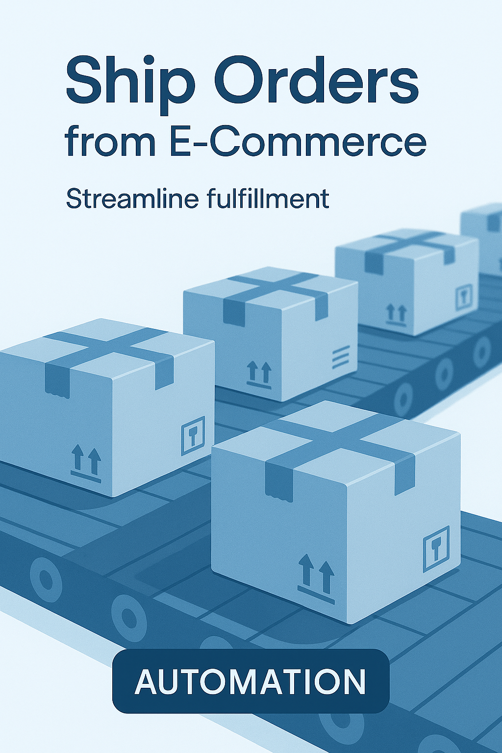 Illustrative graphic depicting automated order fulfillment in e-commerce, featuring stylized packages on a conveyor belt, suitable for marketing or informational purposes.