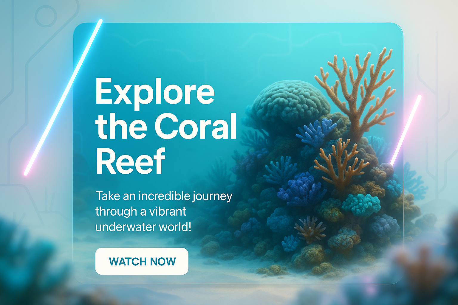 Vibrant promotional graphic inviting viewers to explore an underwater coral reef, featuring colorful marine life and modern design elements ideal for travel or educational content.