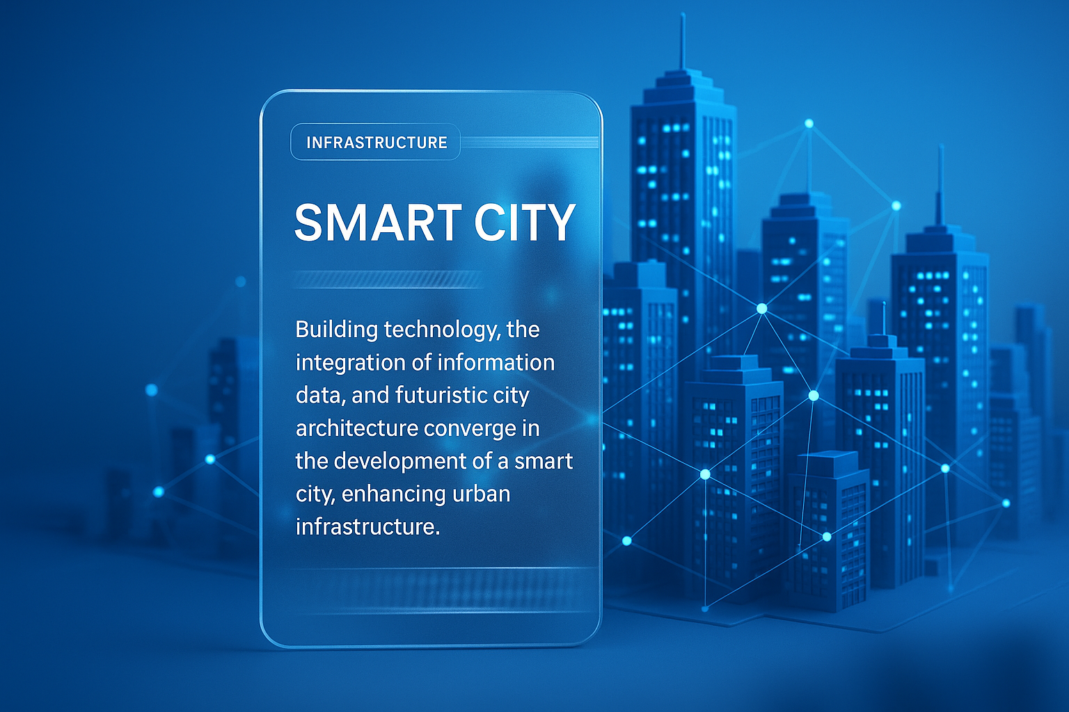 /Collection: /by davooda/Type: PNG/A futuristic digital illustration of a smart city skyline, featuring advanced architecture and technology. The design includes a transparent overlay with information about urban infrastructure.