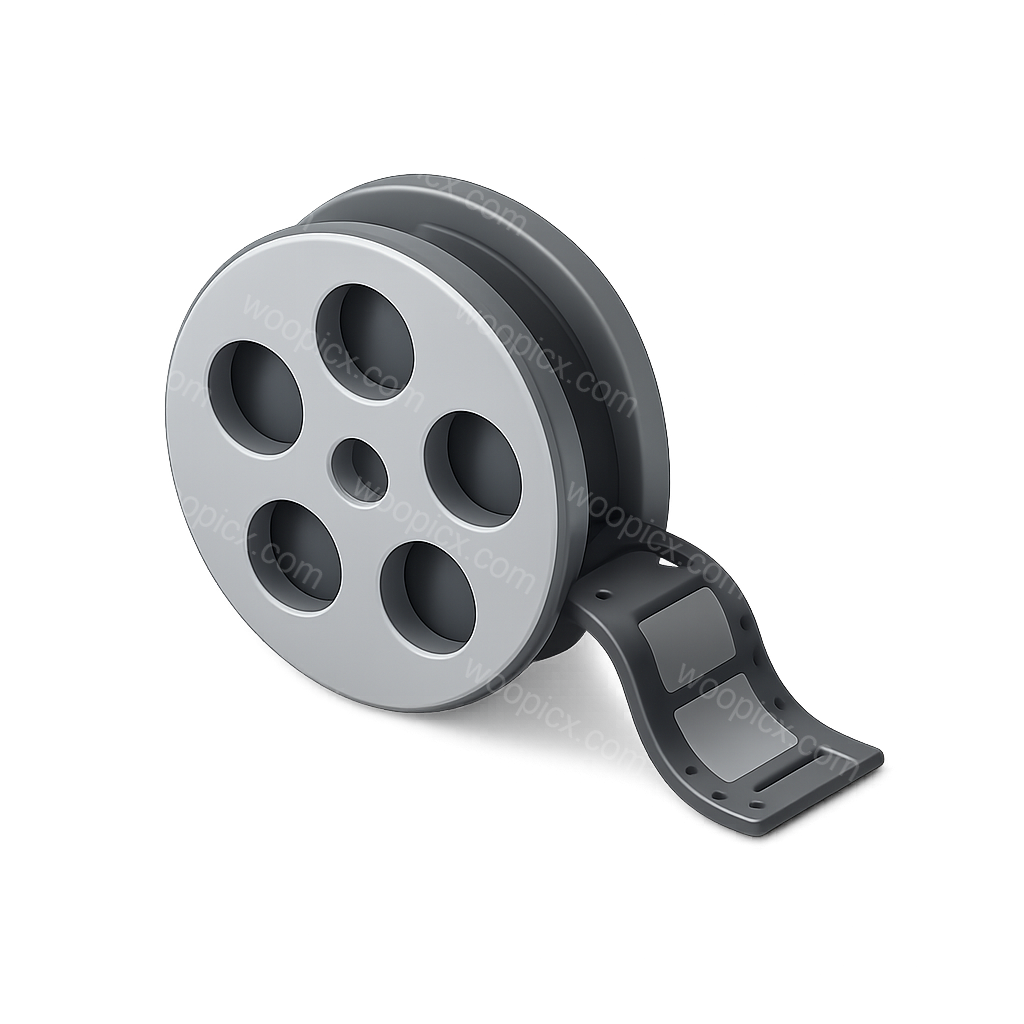 A sleek, stylized 3D icon of a film reel with a filmstrip extending from it. The design features a transparent background, showcasing a modern, isometric view.