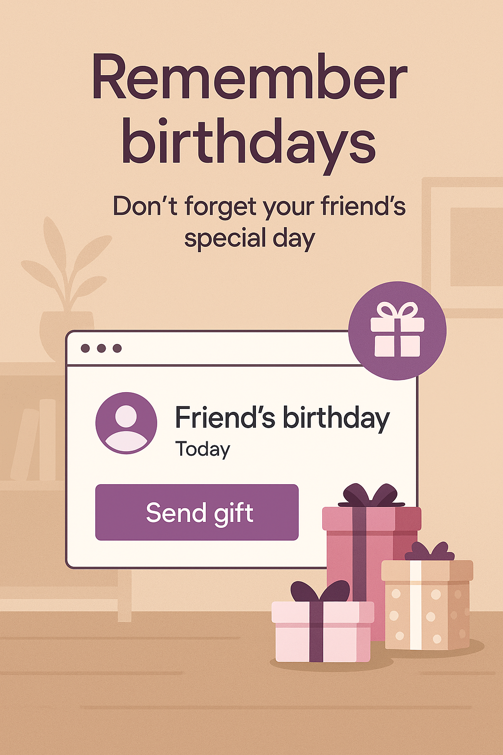 Engaging social media post designed to remind users of friends' birthdays, featuring gift boxes and a simple interface layout for sending gifts.