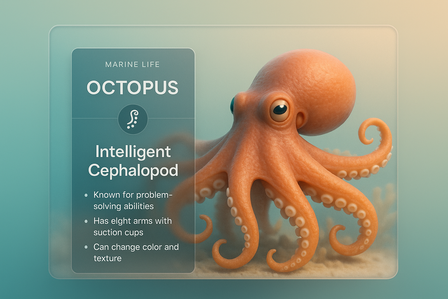 /Collection: /by davooda/Type: PNG/A 3D octopus illustration with an info overlay. The design features a smooth gradient background, integrating text about the octopus's abilities and characteristics.