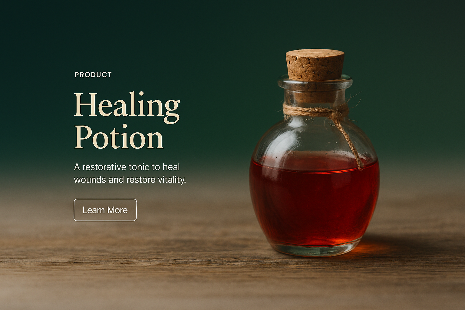 A beautifully styled image of a healing potion in a glass bottle with a cork, set against a gradient background. The design includes product information and a call-to-action button.