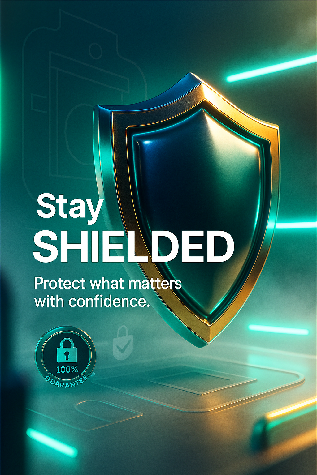 A visually striking neon-themed advertisement featuring a glossy shield. The design emphasizes security with a bold message and glowing accents, creating a modern aesthetic.