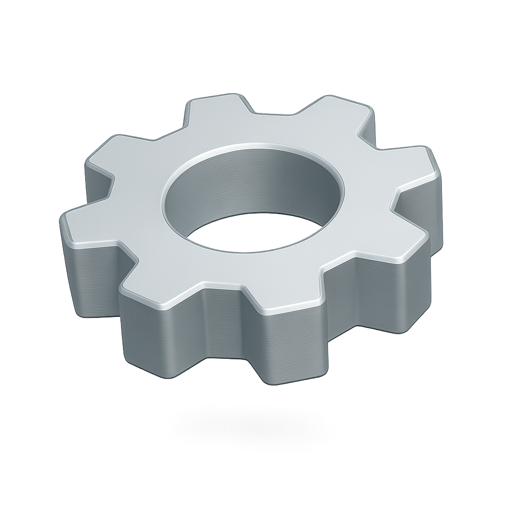 A sleek, metallic 3D gear icon showcasing a three-quarter view with a transparent background. The gear features distinct teeth and a volumetric appearance.