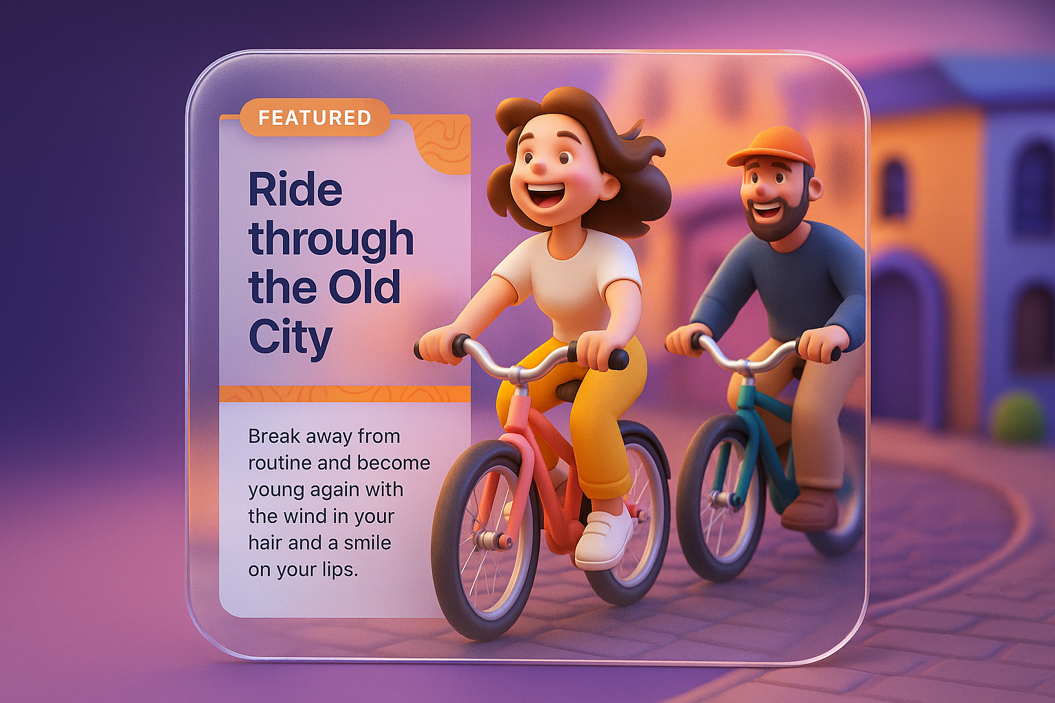 A vibrant illustration of a girl and a man joyfully riding bicycles through an old city. The scene captures the spirit of fun travel, with an engaging design and colorful background.