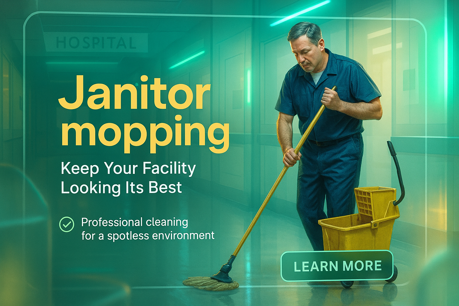 /Collection: /by davooda/Type: PNG/An engaging promotional image showcasing a janitor mopping a hospital corridor, emphasizing professional cleaning services for facilities. The modern design and vibrant colors aim to attract businesses seeking cleaning solutions.
