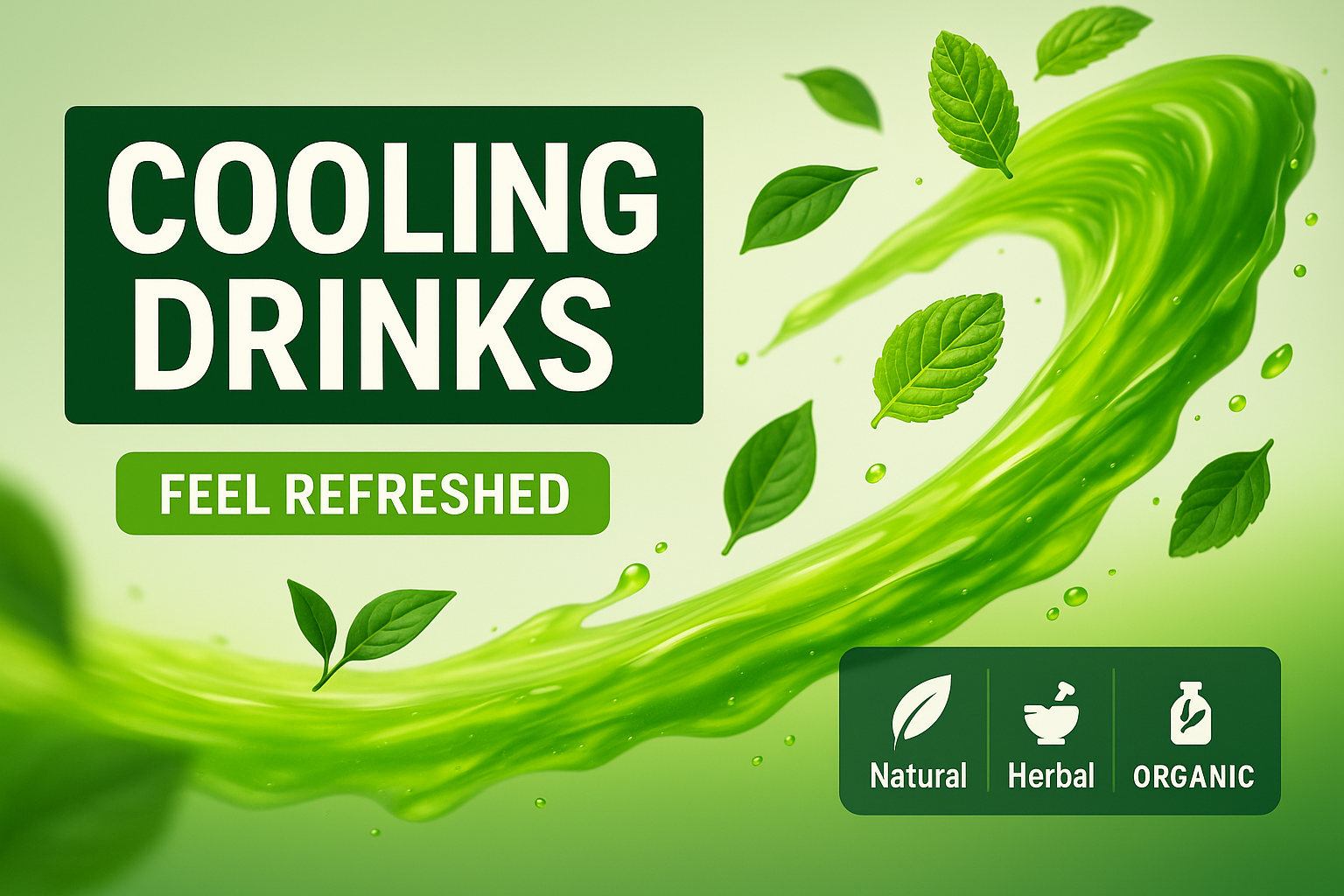 Vibrant promotional graphic highlighting cooling herbal drinks with a fresh, organic theme. Ideal for beverage marketing and health-focused campaigns.