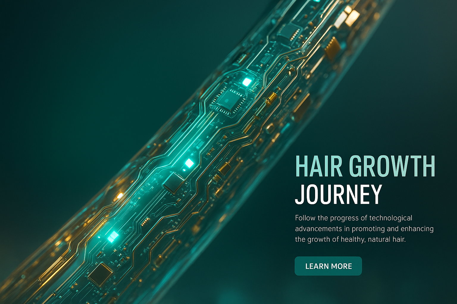 /Collection: /by davooda/Type: PNG/A hyperrealistic close-up of hair growth technology, showcasing a glass-like surface embedded with glowing micro-LEDs and intricate metallic components. The scene is illuminated with neon accents and features a soft, foggy background.