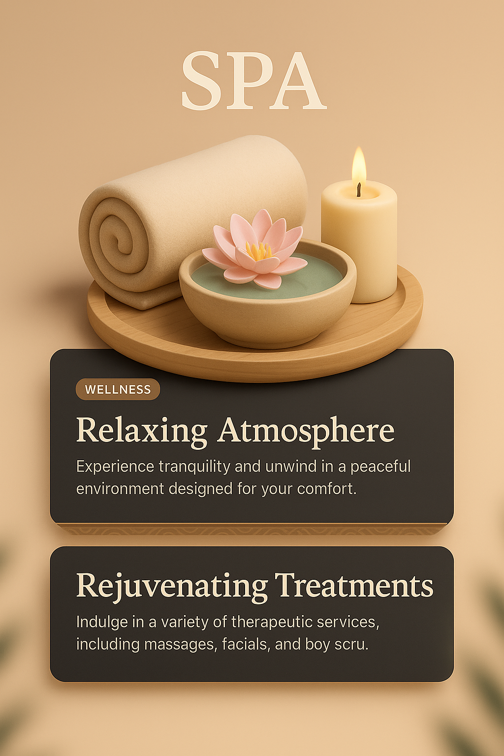 /Collection: /by davooda/Type: PNG/A visually appealing 3D illustration for a spa-themed web design. Features calming elements like a candle, rolled towels, and a water bowl with a lotus flower, combined with stylish text blocks.
