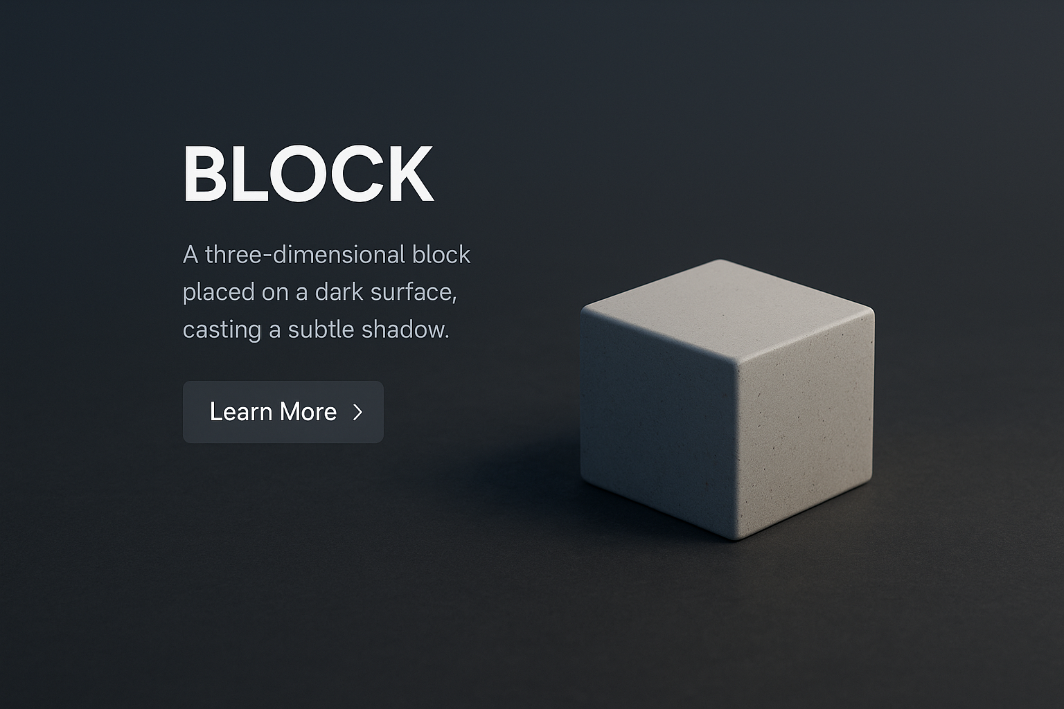 A realistic 3D rendering of a block on a dark surface, with a subtle shadow. Accompanied by text elements including a title and a call-to-action button.