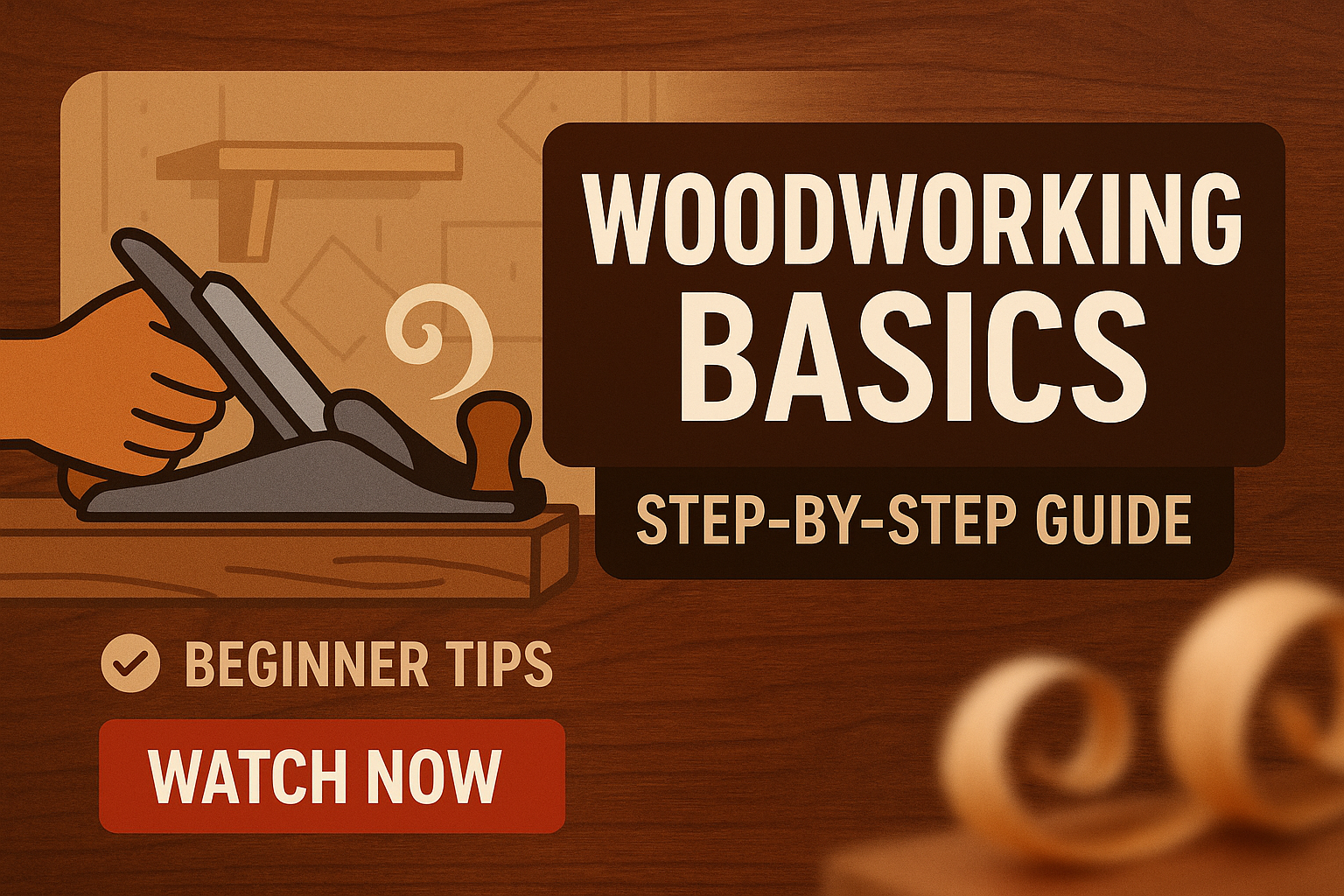 /Collection: /by davooda/Type: PNG/Informative graphic for a woodworking tutorial featuring a hand plane and wood shavings, designed for beginners. Ideal for social media or educational content.