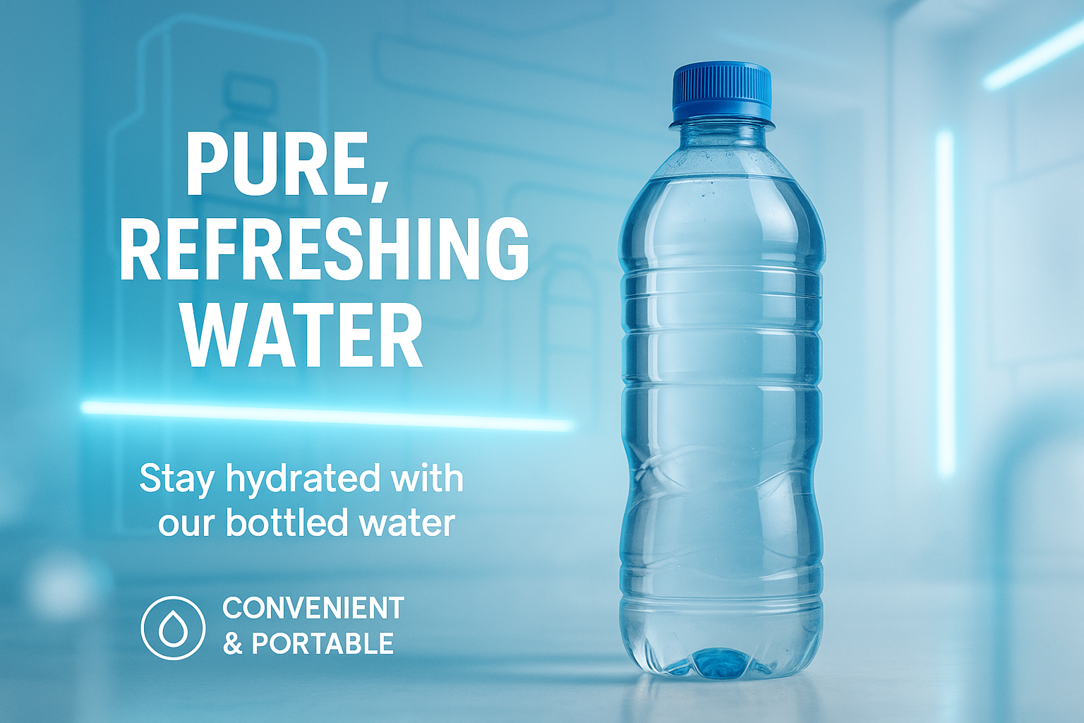 /Collection: /by davooda/Type: PNG/Promotional image featuring a clear plastic bottle of water set against a modern, minimalist background. Ideal for marketing bottled water products emphasizing hydration.