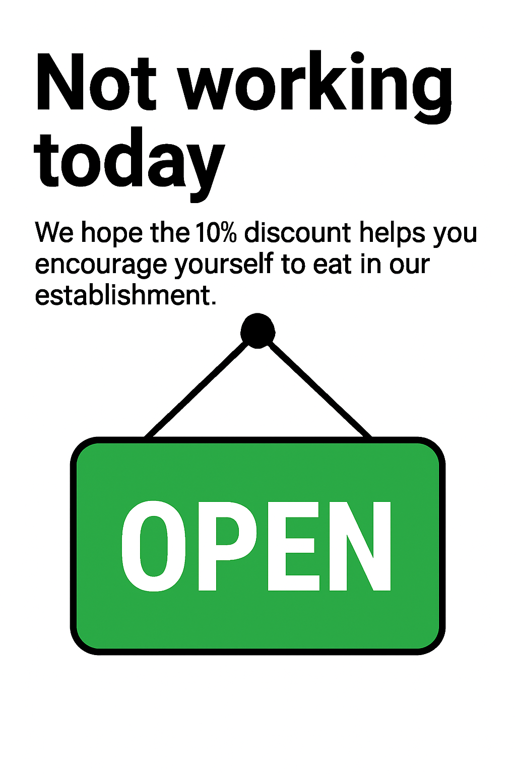 /Collection: /Type: PNG/Informative graphic announcing restaurant closure while promoting a discount offer. The design features bold typography and a simple visual style intended for customer engagement.